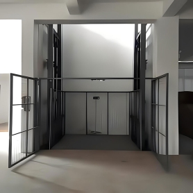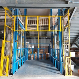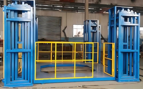 多级套缸式液压升降平台,由四组套缸式支腿、载重平台、升降油缸、牵引链条、泵站、控制系统组成。通过泵站驱动油缸带动四组套缸支腿的升降,连同平台一起升降。